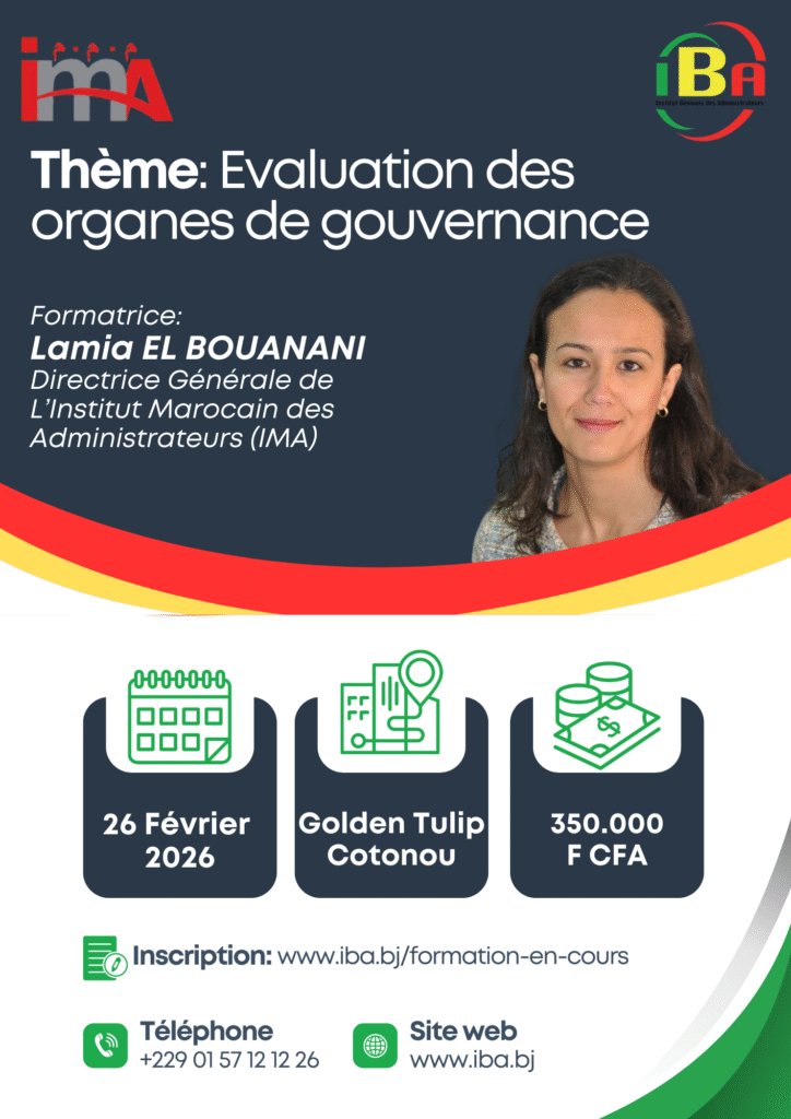 L’Institut Béninois des Administrateurs (IBA) œuvre pour la professionnalisation des administrateurs et la promotion d’une gouvernance responsable au Bénin. À travers ses formations, certifications et distinctions, l’IBA accompagne les organisations dans l’alignement avec les standards internationaux.